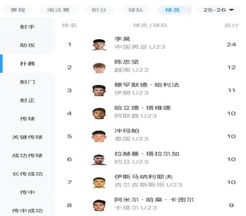 中国U23点球大战神奇挺进亚洲杯四强,李昊4场比赛常规时间保持零封,已经做出惊人的24次扑救,比第二名越南门将陈忠坚(12次)整整多出一倍。
