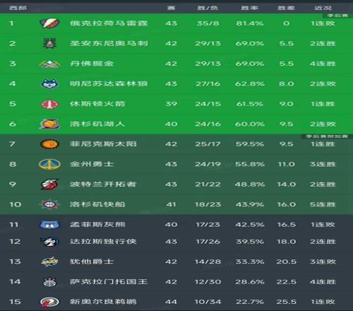 随着湖人惨败16分,雷霆2分惜败,西部最新积分榜如下!马刺第2