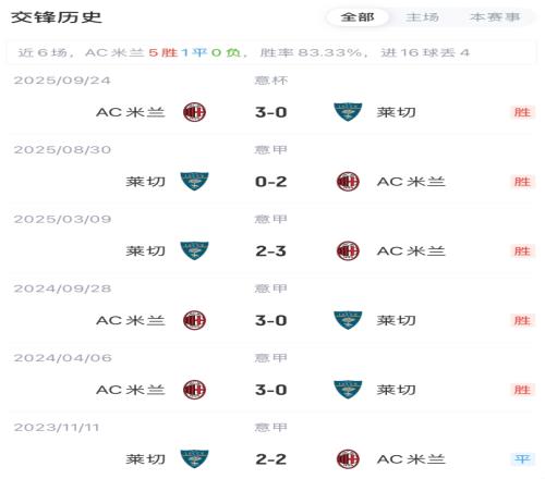 米兰vs莱切首发:美队搭档莱奥、拉比奥特、里奇、亚沙里先发