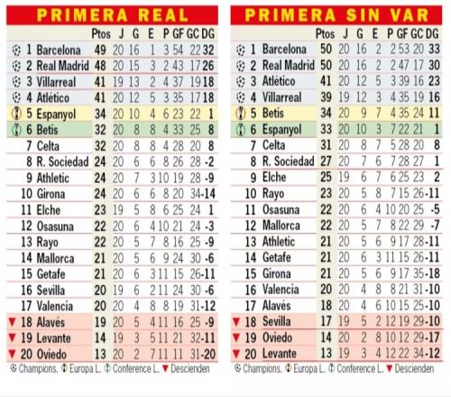《阿斯报》列“如果没有VAR”西甲积分榜: