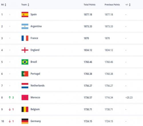 FIFA最新排名:西班牙阿根廷仍前二摩洛哥升第8塞内加尔升第12