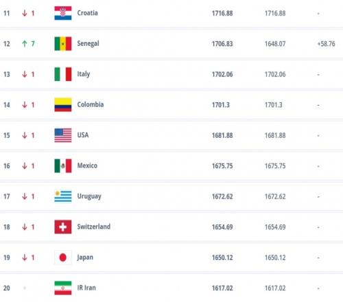 摩洛哥非洲杯夺得亚军,上升3名排在第八。塞内加尔非洲杯夺冠,排名升至第12,上升7名。