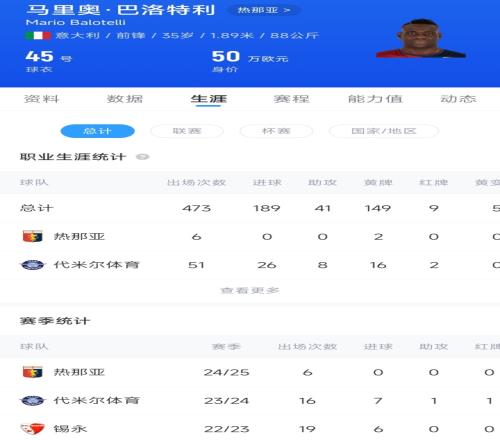 巴洛特利上一次出场比赛已经是2024年12月22日,热那亚在意甲联赛1-2不敌那不勒斯。在2025年7月合同到期离开热那亚后,巴洛特利过去半年时间一直没有找到下家。目前35岁的巴洛特利德转身价为50万欧元。