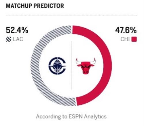 ESPN今日给出本场胜率预测,快船52.4%占上风,公牛47.6%。