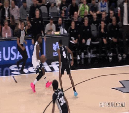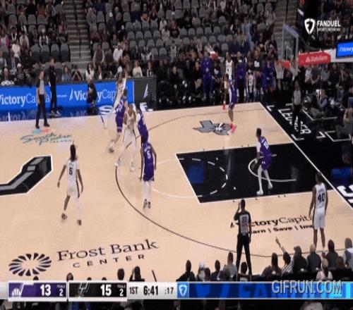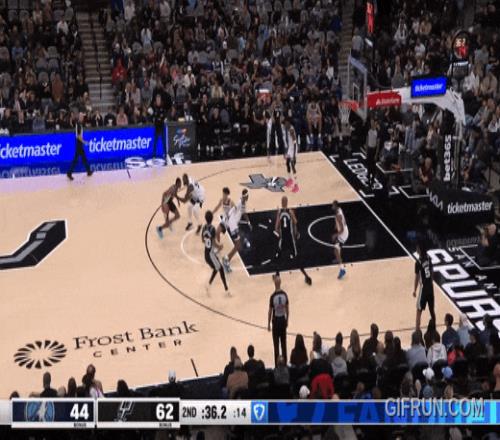 还是马刺最快的福克斯来跟华兹,被华兹迎面强投:干扰不到。