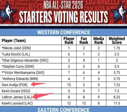 球员投票他还领先两名,但是球迷投票,他落后给阿夫迪亚太多了,阿夫迪亚有220万票,詹姆斯居然只有181万票,再加上媒体投票他和阿夫迪亚都是第9,排名因此就不如他了。但是美国媒体也出来喊冤,认为詹姆斯在媒体里首先有巨大的号召力和影响力,他的媒体投票怎么可能不如阿夫迪亚?美国媒体怎么可能不支持他去支持阿夫迪亚了呢?