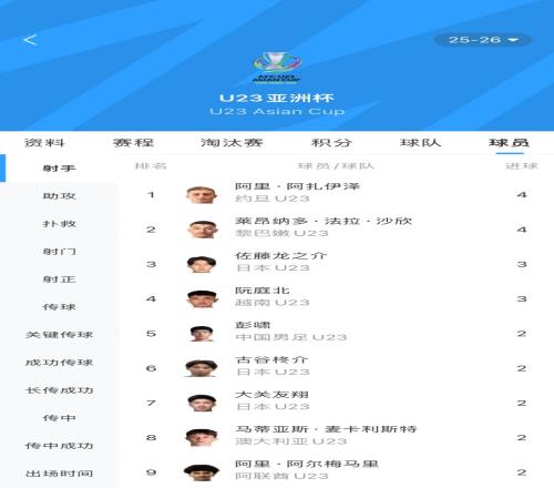 目前,彭啸U23亚洲杯5场攻入2球,目前与7名球员并列第5。但是在所有参赛中卫中,他的进球数是最多的。同时,他也是目前U23国足的队内射手王。