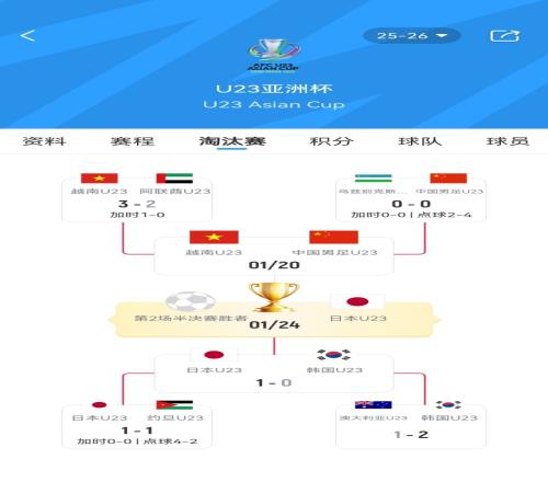 体育播报01月20日宣 U23亚洲杯半决赛首场,日本U23战胜韩国U23晋级决赛,下一场半决赛中国男足U23vs越南U23将在北京时间今晚23:30开球。